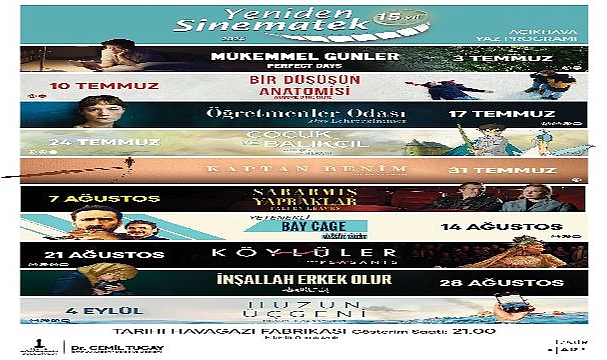 İzmir Büyükşehir Belediyesi’nin “Yeniden Sinematek” gösterimleri, yaz döneminde Tarihi Havagazı Fabrikası’ndaki çim alanda ücretsiz olarak seyircilerle buluşacak. Temmuz, ağustos ve eylül aylarındaki tüm gösterimler de saat 21.00’de başlayacak.