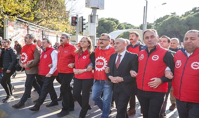 İzmir Büyükşehir Belediye Başkanı Tunç Soyer, DİSK Genel İş Sendikası işçilerinin, vergide adalet ve asgari ücret talepleri için düzenlediği yürüyüşe katıldı. DİSK Genel Başkanı Arzu Çerkezoğlu ve Genel İş Genel Başkanı Remzi Çalışkan’ın da katıldığı eylemde, işçiler asgari ücret talepleri ile vergi düzenlemesinin adil olması istendi