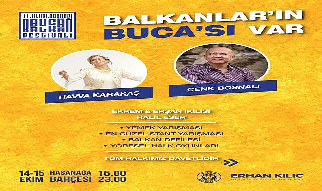 BUCA Belediyesi, bu yıl 11. kez Uluslararası Buca Balkan Festivali’ni düzenleyecek. Balkan kültürünün tüm güzelliklerinin sergileneceği festivalde, Balkan yemekleri yarışması, defile, en güzel stant yarışması ile sevilen sanatçılar Havva Karakaş ve Cenk Bosnalı konserleri yer alacak