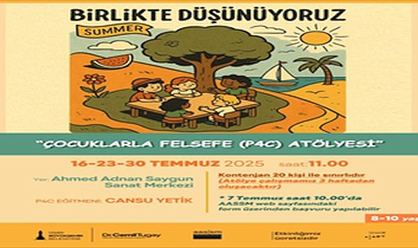 İzmir Büyükşehir Belediyesi Ahmed Adnan Saygun Sanat Merkezi (AASSM), 16, 23 ve 30 Temmuz tarihlerinde 8-10 yaş arası çocuklar için “Birlikte Düşünüyoruz Çocuklarla Felsefe (P4C) Atölyesi” düzenliyor. Çocukların soru sormayı, farklı düşünmeyi ve birlikte keşfetmeyi deneyimleyeceği atölyeye katılmak için başvurular başladı.