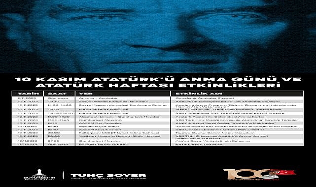 İzmir, Türkiye Cumhuriyeti'nin kurucusu Mustafa Kemal Atatürk'ün 85’inci ölüm yıldönümünde büyük bir özlemle Ata’sını anacak. İzmir Büyükşehir Belediye Başkanı Tunç Soyer, 10 Kasım programına saat 08.50’de Cumhuriyet Meydanı’nda çelenk sunma töreniyle başlayacak. Saatler 09.05'i gösterdiğinde tüm yurtta olduğu gibi İzmir'de de siren sesleriyle birlikte saygı duruşunda bulunulacak. İzmir Büyükşehir Belediyesi Sosyal Projeler Dairesi Başkanlığı ise Konak Atatürk Meydanı’nda saat 09.05’te “7’den 77’ye İzindeyiz” koreografisi ile binlerce İzmirliyi buluşturacak. Ardından Konak Atatürk Meydanı’nda İzmir Büyükşehir Belediyesi 100. Yıl Cumhuriyet Korosu’nun Ata’ya Şarkılar konseri var. Atatürk’e yazılan mektuplar sergilenecek10 Kasım Atatürk'ü Anma Günü programı saat 17.00'de Alsancak Limanı’ndan Cumhuriyet Meydanı’na kortejle devam edecek. İzmirliler Atatürk’ün 350 metre uzunluğundaki dev posterini taşıyacak. İzmir Büyükşehir Belediye Başkanı Tunç Soyer de tüm ilçelerden katılım beklenen bu anlamlı yürüyüşte İzmirlilere eşlik edecek. Saat 17.30 ile 17.45 arasında Cumhuriyet Meydanı’nda İzmir Büyükşehir Belediyesi Türk Halk Müziği Korosu ile Atatürk'ün Sevdiği Türküler hep bir ağızdan söylenecek. Saat 18.15’te Ahmed Adnan Saygun Sanat Merkezi’nde (AASSM) “Senin Atatürk’ün” sergisi ile 2022 yılından bu yana İzmirlilerin Atatürk’e yazdıkları mektuplar sergilenecek. Saat 18.30’da AASSM Küçük Salon’da tarihçi ve yazar Sinan Meydan “Cumhuriyet'in 100. Yılında Atatürk'ü Anlamak” söyleşisi yapılacak. AASSM Küçük Salon’da İzmir Büyükşehir Belediyesi Çoksesli Kadınlar Korosu’ndan Şarkılar konseri ise saat 19.30’da ücretsiz düzenlenecek. Saat 20.00’de Yeşilyurt Mustafa Necati Kültür Merkezi’nde İzmir Büyükşehir Belediyesi THM Orkestrası Atatürk'ü Anma Konseri solist Pelin Kadıoğlu eşliğinde yapılacak. Ayrıca İzmir Büyükşehir Belediyesi Şehir Tiyatroları saat 20.00’de “Benim Naciz Vücudum” oyununu İsmet İnönü Sanat Merkezi’nde gösterime sunacak. Ata’ya saygı yürüyüşüGazi Mustafa Kemal Atatürk’ü anma programı bir günle kalmayarak 12 Kasım Pazar günü de devam edecek. 09.30’da çeşitli dağcılık kulübü üyeleri Cumhuriyet Meydanı’nda buluşarak Balçova Terapi Ormanı’nda Ata’ya Saygı Yürüyüşü düzenleyecek.
