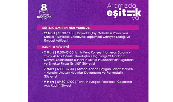 İzmir Büyükşehir Belediyesi, 8 Mart Dünya Kadınlar Günü kapsamında bu yıl "Aramızda Eşitlik Var" temasıyla kentin dört bir yanında kapsamlı bir program hayata geçiriyor. Kültürpark merkezli etkinliklerle emek ve dayanışma yan yana gelirken; kültür, sanat, spor, üretim ve söyleşi buluşmalarıyla 8 Mart’ın eşitlik çağrısı tüm kente yayılıyor.