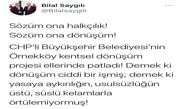 AK Parti İzmir İl Başkanı Bilal Saygılı, sosyal medya hesabından yaptığı açıklamada şu ifadelere yer verdi," Sözüm ona halkçılık! Sözüm ona dönüşüm! CHP’li Büyükşehir Belediyesi’nin Örnekköy kentsel dönüşüm projesi ellerinde patladı! Demek ki dönüşüm ciddi bir işmiş; demek ki yasaya aykırılığın, usulsüzlüğün üstü, süslü kelamlarla örtülemiyormuş! Bakanlığın raporu ortada. Lamı cimi yok! İZBETON üzerinden kurduğunuz tezgaha, parti yöneticilerinizin ortak olduğu kooperatifleri dahil etmiş, kamu kaynaklarını, yani İzmir’in parasını el birliği ile hiç etmişsiniz! Depremi iliklerine kadar yaşama riski olan İzmir’in Belediyesinde Kentsel Dönüşüm Daire Başkanlığı’nı kapatmaya kadar giden bir korku tüneli içindesiniz. Evet; korkun! Çünkü tüm bu yaptıklarınız önünüze bir bir gelecek. Sabahın seherinde yaptığınız, “Her şey çok güzel olacak” açıklamalarınız da artık inandırıcı olmayacak. Bunca vebal, havada kalmayacak! İzmir, bunca yanlışın hesabını elbet soracak."