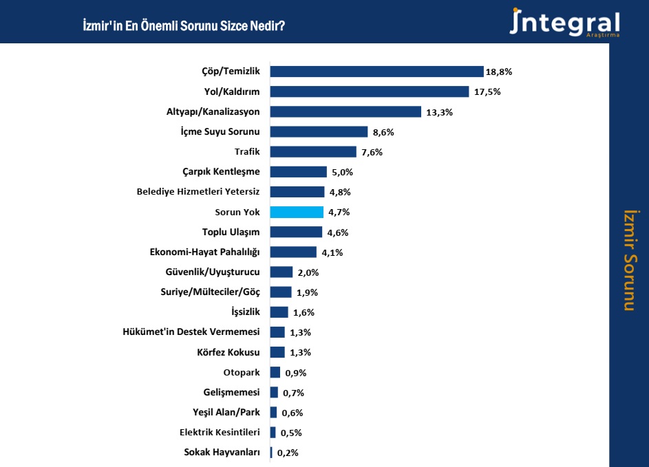 İntegral Araştırma İzmir’in sorunları başlıklı açıklamasında kentin en önemli sorunlarına yönelik analizi paylaştı. Buna göre, İzmirliler kendilerine açık uçlu olarak yöneltilen “İzmir’in en önemli sorunu nedir?” sorusuna 19 farklı başlıkta yanıt verdi. Listenin başında temizlik, yol kaldırım sorunları yer aldı. İfade edilen sorunların %84’ünün doğrudan belediye temel belediye hizmetlerine yönelik cevaplardan oluştuğu saptanırken, %12’sinin hayat pahalılığı, işsizlik, mülteci-göç sorunu, uyuşturucu-güvenlik gibi daha çok merkezi hükümetin yetki alanındaki sorunlardan oluştuğu gözlendi.