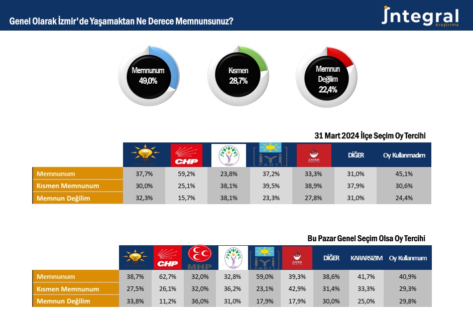 İntegral Araştırma’nın verilerine göre “İzmir’de yaşamaktan memnun musunuz?” sorusuna memnunum diyenlerin oranı 2018 araştırmasında %81’i geçiyorken 2026 Ocak’ta %49’a geriledi. İntegral Araştırma, “Kısmen memnunum ve Memnun değilim” yanıtlarındaki aşırı artışı “Sosyolojik bir deprem” olarak tanımladı. Yapılan açıklamada; İzmir’de yaşam memnuniyetindeki düşüşün ülkenin içinde bulunduğu sosyo-ekonomik-siyasal gidişatın yanı sırayerel yönetimlerin sorumluluk alanındaki temel kentsel hizmetlere erişimdeki sıkıntılarla açıklamanın mümkün olduğu vurgulandı.