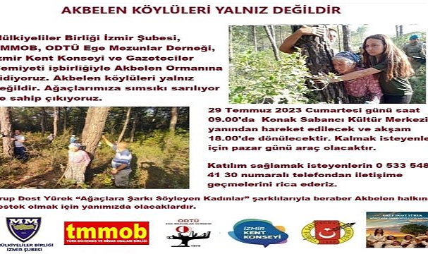 Bugüne kadar yaptıkları açıklamalarla Akbelen Ormanı'nda ağaç kesilmesine karşı çıkan, Mülkiyeliler Birliği İzmir Şubesi, Türkiye Mimar Mühendisler Odaları Birliği, ODTÜ Ege Mezunlar Derneği, İzmir Kent Konseyi ve İzmir Gazeteciler Cemiyeti üyeleri toplu halde Akbelen’e gitme kararı aldı. “Akbelen Ormanı’na gidiyoruz”, “Akbelen köylüleri yalnız değildir”, “Ağaçlarımıza sımsıkı sarılıyor ve sahip çıkıyoruz” sloganlarıyla gerçekleştirilecek gezide sivil toplum kuruluşlarının üyeleri, İkizköy halkına destek verecek. 29 Temmuz 2023 Cumartesi günü saat 09.00’da Konak Sabancı Kültür Merkezi yanından hareket edilecek, akşam 18.00’de dönülecek. Cumartesi gecesi Akbelen Ormanı’nda kalmak isteyenler için pazar günü de araç kaldırılacak. Katılım sağlamak isteyenlerin 0 533 548 41 30 numaralı telefondan iletişime geçmeleri gerekiyor. Grup Dost Yürek “Ağaçlara Şarkı Söyleyen Kadınlar” şarkılarıyla Akbelen halkına destek olmak için etkinlikte olacak.
