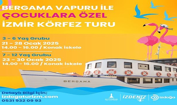 2024-2025 eğitim öğretim dönemi yarıyıl tatili 17 Ocak’ta başlıyor. İzmir Büyükşehir Belediyesi İZDENİZ ve İZDOĞA genel müdürlükleri, okul öncesi ve ilköğretim öğrencilerine özel Körfez turları hazırladı. Geziler, Tarihi Bergama Vapuru ile yapılacak. Vapur, Konak İskelesi'nden hareket ederek sırasıyla Pasaport, Alsancak, Liman, Bayraklı, Alaybey, Karşıyaka, Bostanlı, Üçkuyular, Güzelyalı, Karantina ve Karataş kıyılarından geçecek, turunu yine Konak İskelesi'nde tamamlayacak.
