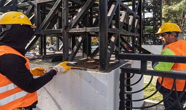 İzmir Büyükşehir Belediyesi, Kültürpark’ın tarihi kapılarından 26 Ağustos Kapısı’nda güçlendirme çalışmasına başladı. Yapı İşleri Dairesi Başkanlığı ekipleri uzun yıllardır kente hizmet veren ve hava koşulları gibi çeşitli nedenlerle yıpranan tarihi kapının çelik aksamını güçlendirecek. Çalışmaların bir hafta içinde tamamlanması planlanıyor.