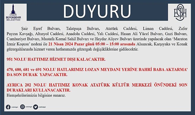 İzmir Büyükşehir Belediyesi Spor Dairesi Başkanlığı’nca organize edilen Maraton İzmir’in 5’incisi 21 Nisan Pazar günü koşulacak. Çeşitli yaş gruplarında yaklaşık 5 bin sporcunun katılması beklenen maraton nedeniyle Karşıyaka, Bayraklı, Altınyol, Bornova, Alsancak, Konak, Karataş, Güzelyalı, Üçkuyular ve İnciraltı bölgelerinde hizmet veren bazı ESHOT ve İZTAŞIT otobüs hatlarının güzergâhlarında, pazar günü 05.00-15.00 saatleri arasında geçici güzergâh değişiklikleri olacak. 602, 608, 660 ve 800 No’lu İZTAŞIT hatları, mevcut güzergâhı takiben Yeni Girne, İzmir Çevre Yolu (Bayraklı Tünelleri), Yüzbaşı İbrahim Hakkı Caddesi, Manas Bulvarı, Ankara Caddesi, Bornova Metro güzergâhlarında hizmet verecek. Lozan Meydanı’nda son durak yapan 470, 680, 681 ve 691 No’lu ESHOT hatları, Eşrefpaşa Caddesi sonrasında varyant güzergahı ile Bahri Baba alanında son durak yapacak. 202 No’lu hat, Konak AKM önündeki son duraklardan kalkış yaparak Mustafa Kemal Sahil Bulvarı üzerinden havalimanı yönünde hizmet verecek. Dönüşte de AKM önünde son durak yapacak. 253 No’lu hattın gidiş güzergâhı; Halkapınar 2 Aktarma Merkezi, Mürsel Paşa, Yeşildere Caddesi, Konak Tüneli, Konak AKM önü olacak. Dönüş güzergâhı ise Konak AKM önü, Mithat Paşa Caddesi, 334/3 Sokak (Sabancı Kültür Merkezi), Mustafa Kemal Sahil Bulvarı, Konak Tüneli, Yeşildere, Mürsel Paşa, Halkapınar 2 Aktarma Merkezi şeklinde olacak. 330 ve 543 numaralı hatlar; Bahriye Üçok son durak, Girne Caddesi, Yeni Girne, İzmir Çevre Yolu (Bayraklı Tünelleri), Yüzbaşı İbrahim Hakkı Caddesi ve Manas Bulvarı’ndan sonra mevcut güzergâhında hizmet verecek. 126, 135, 136, 137, 197, 222, 258, 326, 487, 847 ve 853 numaralı hatlar; Bahriye Üçok son durak ve Girne Caddesi’nden sonra mevcut güzergâhında devam edecek. 196 No’lu hat, Bahriye Üçok son durak, Girne Caddesi, Anadolu Caddesi sonrası mevcut güzergâhında hizmet verecek. 800 No’lu hat, mevcut güzergâhını takiben; Yeni Girne, İzmir Çevre Yolu (Bayraklı Tünelleri), Yüzbaşı İbrahim Hakkı Caddesi, Manas Bulvarı, Ankara Caddesi, Bornova Metro güzergâhında çalışacak. 240 No’lu hattın Halkapınar Metro istikametine gidişi; mevcut güzergâhı takiben Yeni Girne, Anadolu Caddesi Kesişim Girne Kavşağı’ndan geri dönüp tekrar Yeni Girne Bulvarı, İzmir Çevre Yolu (Bayraklı Tünelleri), Yüzbaşı İbrahim Hakkı Caddesi, Manas Bulvarı, Zafer Payzın Kavşağı, Halkapınar 2 son durak şeklinde olacak. 34, 35, 36, 39, 42, 44, 45, 46, 302, 466 ve 838 numaralı hatlar; Refik Saydam ve Gazi Bulvarı kesişimi kavşağından (9 Eylül Meydanı) dönüş yapıp ring hat olarak çalışacak. 102 ve 502 numaralı hatlar Anadolu Caddesi, Çevre ve Şehircilik İl Müdürlüğü, 1597/2 sokak, 1597/1 sokak, Adnan Kahveci Köprüsü, Smyrna Bulvarı sonrası mevcut güzergâhlarından hizmete devam edecek. 125 No’lu hattın Halkapınar Metro 2 istikametine gidişi; mevcut güzergâhı takiben Anadolu Caddesi, Naldöken Durağı, Cevdet Bilsay, Doç. Dr. Bahriye Üçok Bulvarı, Atatürk Bulvarı, Girne Bulvarı, Yeni Girne, İzmir Çevre Yolu (Bayraklı Tünelleri), Yüzbaşı İbrahim Hakkı Caddesi, Manas Bulvarı, Zafer Payzın Kavşağı, Halkapınar 2 son durak şeklinde olacak. 77, 78, 140, 147, 148 ve 477 numaralı hatların Halkapınar Metro 2 istikametine gidişi; mevcut güzergâhı takiben Yeni Girne, İzmir Çevre Yolu (Bayraklı Tünelleri), Yüzbaşı İbrahim Hakkı Caddesi, Manas Bulvarı, Zafer Payzın Kavşağı ve Halkapınar 2 son durak şeklinde olacak. 921 No’lu hat, Alsancak Garı istikametine gidişte; Bahriye Üçok son durak, Girne Caddesi, Yeni Girne, İzmir Çevre Yolu (Bayraklı Tünelleri), Yüzbaşı İbrahim Hakkı Caddesi, Manas Bulvarı, Fatih Caddesi, 1561 sokak (Çınarlı Endüstri Meslek Lisesi), 2844 sokak (Halkapınar Kapalı Spor Salonu), Halkapınar 1 Aktarma Merkezi güzergâhını kullanacak. Bostanlı İskele’ye dönüşünde ise Halkapınar 1 son durak, Şehitler Caddesi, Fatih Caddesi, Manas Bulvarı ve mevcut güzergâhı şeklinde devam edecek. 912 No’lu hattın Alsancak Garı istikametine gidişi; mevcut güzergâhı takiben Yeni Girne, İzmir Çevre Yolu (Bayraklı Tünelleri), Yüzbaşı İbrahim Hakkı Caddesi, Manas Bulvarı, Fatih Caddesi, 1561 sokak (Çınarlı Endüstri Meslek Lisesi), 2844 sokak (Halkapınar Kapalı Spor Salonu) , Halkapınar 1 Aktarma Merkezi şeklinde olacak. Egekent Aktarma Merkezi’ne dönüşte ise Halkapınar 1 son durak, Şehitler Caddesi, Fatih Caddesi, Manas Bulvarı, mevcut güzergâh kullanılacak. 963 No’lu hattın Alsancak Garı istikametine gidişi; mevcut güzergâhı takiben, Fatih Caddesi, 1561 sokak (Çınarlı Endüstri Meslek Lisesi), 2844 sokak (Halkapınar Kapalı Spor Salonu) , Halkapınar 1 Aktarma Merkezi şeklinde olacak. Evka 3 Metro dönüşünde ise Halkapınar 1 son durak, Şehitler Caddesi, Fatih Caddesi, Manas Bulvarı, mevcut güzergâh kullanılacak. 435, 543, 330 ve 921 numaralı hatlar, Bostanlı İskele yerine Bahriye Üçok’ta son durak yapacak. 777 No’lu hattın son durağı ise Karşıyaka İskele yerine Bostanlı İskele olacak. 470, 680, 681 ve 691 numaralı hatlar, Lozan Meydanı yerine Konak Bahri Baba Aktarma Merkezi’nde son durak yapacak. 202 No’lu hat ise Konak AKM önündeki durakları kullanacak. 361 ve 951 numaralı hatlar, koşu süresince hizmet vermeyecek. İZDENİZ’den ring seferleriİZDENİZ Genel Müdürlüğü’ne bağlı Bostanlı-Üçkuyular feribotları, pazar günü 08.30-12.00 saatleri arasında çalışmayacak. Yerine yolcu gemileri sefer yapacak. Gemiler, Bostanlı İskelesi’nden 08.30, 9.30, 10.30 ve 11.30’da; Üçkuyular İskelesi’nden ise 09.00, 10.00 ve 11.00’de kalkacak. Ayrıca Maraton İzmir katılımcılarının rahat ulaşımı için Bostanlı ve Karşıyaka
