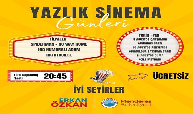 Yazlık Sinema Günleri Menderes’te başlıyor. Menderes Belediyesi Başkan V. Erkan Özkan her hafta farklı mahallelerde düzenlenecek etkinliğe tüm vatandaşları davet etti Menderes Belediyesi Kültür ve Sosyal İşler Müdürlüğü tarafından sürdürülen çalışmalar kapsamında ilçede sinema etkinlikleri gerçekleştirilecek. Yazlık Sinema Günleri 44 mahalleyi kapsayacak şekilde düzenlenecek. Ücretsiz etkinlikler renkli görüntülere sahne olacak. Her hafta 3 film farklı mahallelerde izleyiciyle buluşacak. Spiderman-No Way Home, 100 Numaralı Adam ve Ratatouille filmleri beyaz perdeye aktarılacak. Yaz sezonu boyunca 44 mahallenin tamamında film gösterimleri sürecek. Kültür etkinlikleri ile vatandaşların yanında olmaya devam ettiklerini kaydeden Menderes Belediye Başkan V. Erkan Özkan, ‘’ "İlçemizde kültür etkinliklerine önem veriyoruz. Yazlık Sinema Günleri etkinliğimizde ilçemizde sürdürdüğümüz kültür çalışmalarımızın bir parçası. Her hafta farklı mahallelerimizde vatandaşlarımızı yazlık sinema ile buluşturacağız. Tüm halkımızı sinema coşkusunu yaşamaya davet ediyor, sinema şölenine katılacak vatandaşlarımıza iyi seyirler diliyorum’’ dedi.