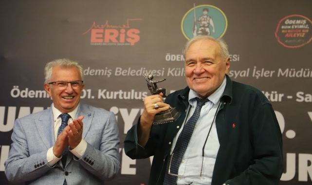 Söyleşi sonrası Ödemiş Belediye Başkanı Mehmet Eriş, Prof. Dr. İlber Ortaylı’ya günün anısı olarak efe heykeli takdim etti.