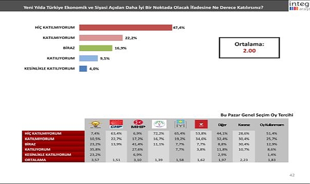Araştırmaya göre İzmirliler; Abdullah Öcalan’ın Mecliste konuşma yapması ve PKK’ya çağrıda bulunmasının terörü sona erdirmeyeceğini ve Kürt sorununu çözmeyeceğini düşünüyor. Bahçeli’nin çağrısını desteklemeyenlerin ya da koşullu destekleyenlerin yüksek oranı ise oldukça çarpıcı. Suriye’de yaşanan gelişmelere ilişkin verilen “Türkiye ve Erdoğan karnesinde” ise; Erdoğan’ın rolü ve güçlenmesi, ülkenin ekonomik ve siyasi kazanımlarının önüne çıkıyor. Güncel daha pek çok başlığı sorgulayan İntegral’in; İzmirlilerin 2025 yılında ülkenin ekonomik ve siyasal açıdan daha iyi olup olmayacağına ilişkin sorusunun karşılığı ise, “umutsuzluk” olarak ortaya çıktı.