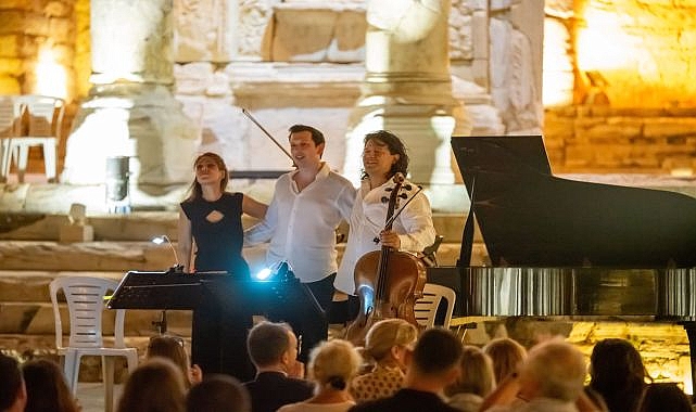 İzmir Kültür Sanat ve Eğitim Vakfı (İKSEV) ile Polonya Cumhuriyeti İstanbul Başkonsolosluğu ve İzmir Fahri Konsolosluğu iş birliği ile 20. ve 21. Yüzyılın en büyük bestecilerinden Krzysztof Penderecki’nin 90. Doğum ve 3. Ölüm yıl dönümü anısına düzenlenen özel konser dün akşam (6 Temmuz) Celsus Kütüphanesi’nde yağmur altında gerçekleşti. Konserin başlamasına beş dakika kala bastıran yağmur yarım saat kadar sürdü. Celsus’u tamamen dolduran izleyiciler konserin iptalini beklerken sanatçılar, “Celsus’un büyülü atmosferinde her şart altında konser verebileceklerini söylediler. Bunun üzerine Penderecki’nin vefatından hemen önce kurduğu Penderecki Trio {Leticia Moreno (keman), Claudio Bohorquez (çello), Łucasz (piyano)} konserlerine Chopin’in Sonat sol minör op. 65 Sonatı ile başladı. Eserin sonlarına doğru tekrar başlayan yağmurla konser kesildi. İzleyicilerinin yerlerini terk etmediğini gören Trio, piyanodan vaz geçerek Kütüphanenin korunaklı sütunlarının arasına sığındı, keman ve çello ile Jozef Wieniawski’nin eserini seslendirdi. Penderecki Trio yağmurun kesilmesi ile doğal ışık altında Krzysztof Penderecki ‘nin Çello ve piyano için 1. Sonatının 1954 versiyonunu seslendirdi ve ardından da bestecinin Chaconne – Papa 2. John Paul anısına adlı eserlerinin Avrupa ve Asya Prömiyerini yaptı. Dinmeyen alkışlara eserin son bölümüyle karşılık veren başarılı Üçlü, arkalarında ıslak ama mutlu izleyiciler bıraktı.